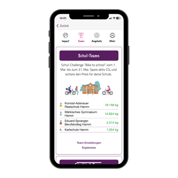 Es handelt sich hier um einen Wettbewerb, der das Fahrradfahren und die Nutzung des ÖPNVs fördern und gleichzeitig die Nutzung der Elterntaxis reduzieren soll. Die Umsetzung findet in Kooperation mit den Stadtwerken Hamm im Rahmen der App hamm: statt und wird über das Zählen/Sammeln von Klima-Talern (CO2-Einsparung) umgesetzt.