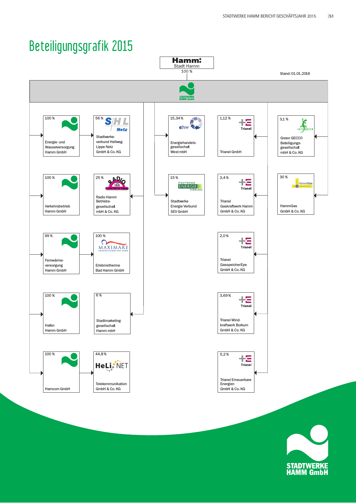 STADTWERKE HAMM BERICHT GESCHÄFTSJAHR 2015 51 Stand 01 01 2016 100 100 99 100 100 44 8 6 100 2 0 3 4 56 15 34 1 12 3 1 Energie und Wasserversorgung HammGmbH Verkehrsbetrieb HammGmbH Fernwärme versorgung HammGmbH Erlebnistherme Bad HammGmbH Hafen HammGmbH HamcomGmbH Telekommunikation GmbH Co KG Stadtmarketing gesellschaft HammmbH Trianel GasspeicherEpe GmbH Co KG Trianel Gaskraftwerk Hamm GmbH Co KG Stadtwerke verbund Hellweg Lippe Netz GmbH Co KG Energiehandels gesellschaft WestmbH Trianel GmbH Green GECCO Beteiligungs gesellschaft mbH Co KG 15 Stadtwerke Energie Verbund SEVGmbH 25 Radio Hamm Betriebs gesellschaft mbH Co KG 30 HammGas GmbH Co KG 3 69 Trianel Wind kraftwerk Borkum GmbH Co KG 5 2 Trianel Erneuerbare Energien GmbH Co KG Beteiligungsgrafik 2015