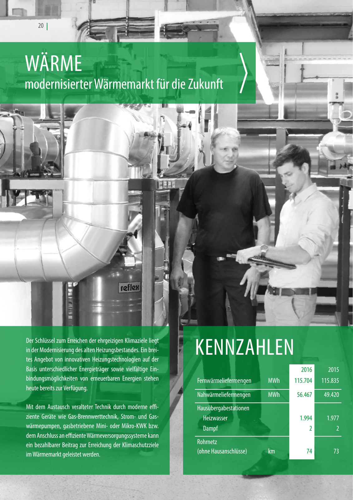WÄRME modernisierter Wärmemarkt für die Zukunft Der Schlüssel zum Erreichen der ehrgeizigen Klimaziele liegt in der Modernisierung des alten Heizungsbestandes Ein brei tes Angebot von innovativen Heizungstechnologien auf der Basis unterschiedlicher Energieträger sowie vielfältige Ein bindungsmöglichkeiten von erneuerbaren Energien stehen heute bereits zur Verfügung Mit dem Austausch veralteter Technik durch moderne effi ziente Geräte wie Gas Brennwerttechnik Strom und Gas wärmepumpen gasbetriebene Mini oder Mikro KWK bzw dem Anschluss an effiziente Wärmeversorgungssysteme kann ein bezahlbarer Beitrag zur Erreichung der Klimaschutzziele im Wärmemarkt geleistet werden KENNZAHLEN 2016 2015 Fernwärmeliefermengen MWh 115 704 115 835 Nahwärmeliefermengen MWh 56 467 49 420 Hausübergabestationen Heizwasser 1 994 1 977 Dampf 2 2 Rohrnetz ohne Hausanschlüsse km 74 73 20