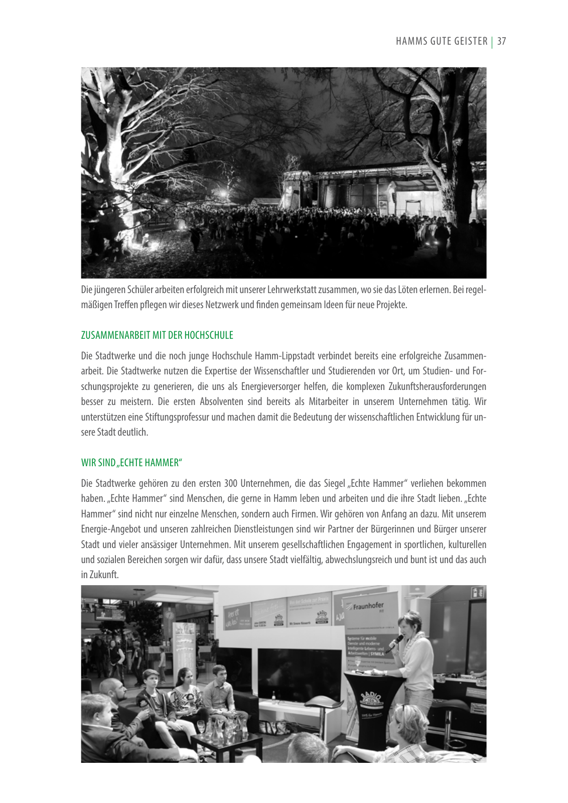 HAMMS GUTE GEISTER Die jüngeren Schüler arbeiten erfolgreich mit unserer Lehrwerkstatt zusammen wo sie das Löten erlernen Bei regel mäßigen Treffen pflegen wir dieses Netzwerk und finden gemeinsam Ideen für neue Projekte ZUSAMMENARBEIT MIT DER HOCHSCHULE Die Stadtwerke und die noch junge Hochschule Hamm Lippstadt verbindet bereits eine erfolgreiche Zusammen arbeit Die Stadtwerke nutzen die Expertise der Wissenschaftler und Studierenden vor Ort um Studien und For schungsprojekte zu generieren die uns als Energieversorger helfen die komplexen Zukunftsherausforderungen besser zu meistern Die ersten Absolventen sind bereits als Mitarbeiter in unserem Unternehmen tätig Wir unterstützen eine Stiftungsprofessur und machen damit die Bedeutung der wissenschaftlichen Entwicklung für un sere Stadt deutlich WIR SIND ECHTE HAMMER Die Stadtwerke gehören zu den ersten 300 Unternehmen die das Siegel Echte Hammer verliehen bekommen haben Echte Hammer sind Menschen die gerne in Hamm leben und arbeiten und die ihre Stadt lieben Echte Hammer sind nicht nur einzelne Menschen sondern auch Firmen Wir gehören von Anfang an dazu Mit unserem Energie Angebot und unseren zahlreichen Dienstleistungen sind wir Partner der Bürgerinnen und Bürger unserer Stadt und vieler ansässiger Unternehmen Mit unserem gesellschaftlichen Engagement in sportlichen kulturellen und sozialen Bereichen sorgen wir dafür dass unsere Stadt vielfältig abwechslungsreich und bunt ist und das auch in Zukunft 37