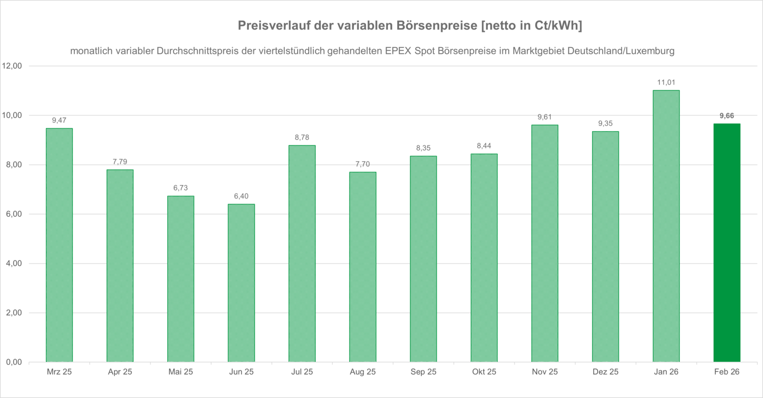 März 25: 9,47 Ct/kWh, April 25: 7,79 Ct/kWh, Mai 25: 6,73 Ct/kWh, Juni 25: 6,40 Ct/kWh, Juli 25: 8,78 Ct/kWh, August 25: 7,70 Ct/kWh, September 25: 8,35 Ct/kWh, Oktober 25: 8,44 Ct/kWh, November 25: 9,61 Ct/kWh, Dezember 25: 9,35 Ct/kWh, Januar 26: 11,01 Ct/kWh, Februar 26: 9,66 Ct/kWh.