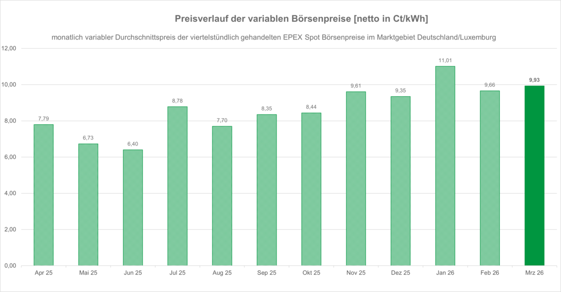April 25: 7,79 Ct/kWh, Mai 25: 6,73 Ct/kWh, Juni 25: 6,40 Ct/kWh, Juli 25: 8,78 Ct/kWh, August 25: 7,70 Ct/kWh, September 25: 8,35 Ct/kWh, Oktober 25: 8,44 Ct/kWh, November 25: 9,61 Ct/kWh, Dezember 25: 9,35 Ct/kWh, Januar 26: 11,01 Ct/kWh, Februar 26: 9,66 Ct/kWh, März 26: 9,93 Ct/kWh.