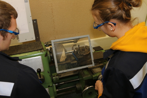 Eine weitere wichtige Aufgabe war das Drehen an der Drehmaschine. Dort haben wir die Achsen und Räder des Lkw´s gedreht. Mit der Drehmaschine können nämlich runde Werkstücke bearbeitet werden. Sorgfalt und Konzentration sind hier besonders wichtig. Außerdem haben wir aus Sicherheitsgründen jeweils zu zweit an der Maschine gearbeitet.