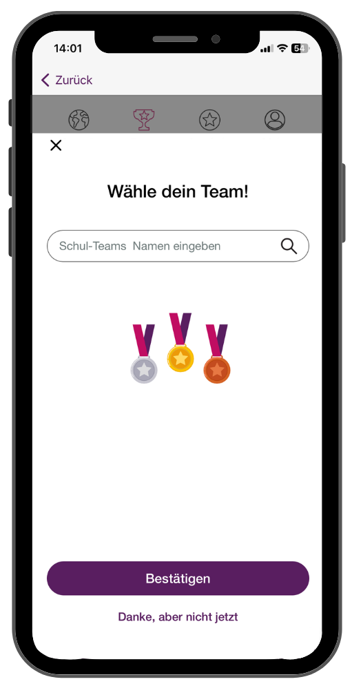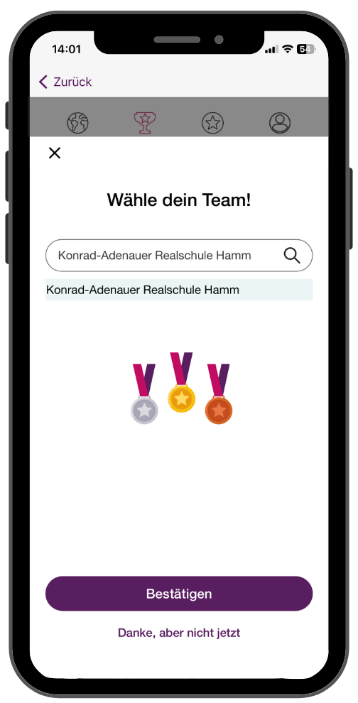Anschließend ordnen sich die Teilnehmer:innen eigenständig ihrer Schule in der App zu.