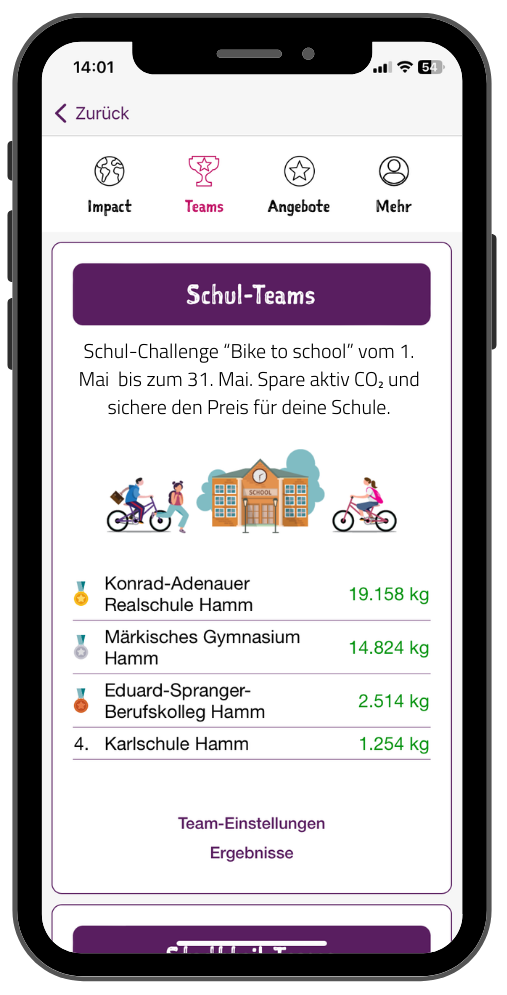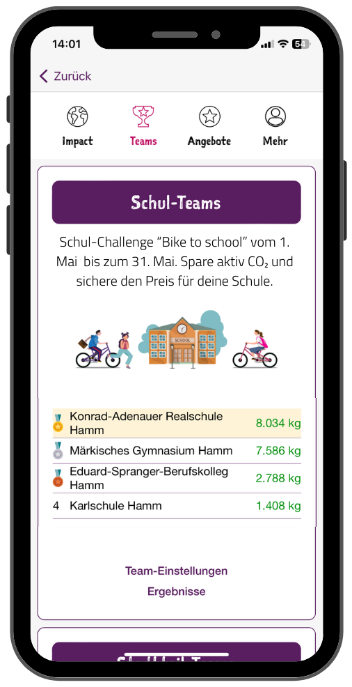 Es handelt sich hier um einen Wettbewerb, der das Fahrradfahren und die Nutzung des ÖPNVs fördern und gleichzeitig die Nutzung der Elterntaxis reduzieren soll. Die Umsetzung findet in Kooperation mit den Stadtwerken Hamm im Rahmen der App hamm: statt und wird über das Zählen/Sammeln von Klima-Talern (CO2-Einsparung) umgesetzt.